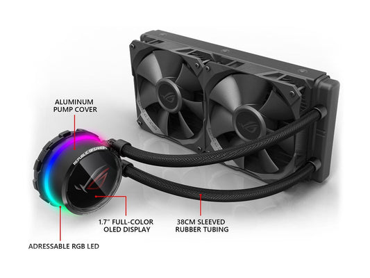 ASUS ROG Ryuo 240 RGB AIO Liquid CPU Cooler 240mm Radiator (Dual 120mm 4-pin PWM Fans) with LIVEDASH OLED Panel and FanXpert Controls, 90RC0040-M0AAY0