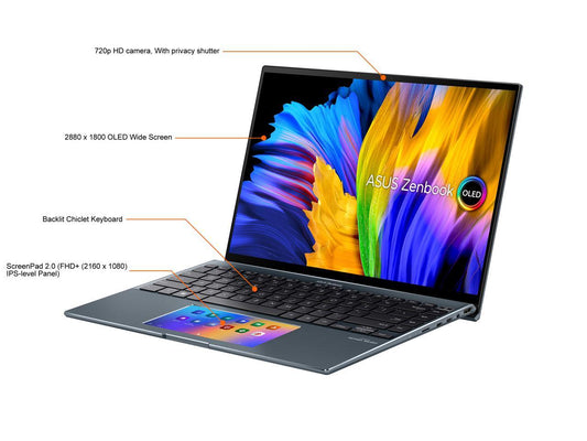 ASUS ZenBook 14X OLED Laptop, 14" WQXGA+ 16:10 Touch Display, Intel Core i7-1165G7 CPU, NVIDIA GeForce MX450, 16GB RAM, 512GB SSD, Windows 11 Pro, Pine Grey, UX5400EG-XB73T