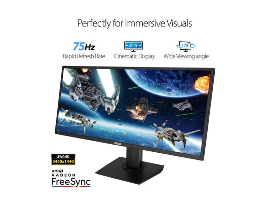ASUS VP348QGL 34" Quad HD 3440 x 1440 75Hz 4ms 2xHDMI DisplayPort Adaptive-SYNC/FreeSync HDR-10 Blue Light Filter Flicker Free Asus Eye Care Built-in Speakers Ultra Wide Backlit LED Gaming Monitor