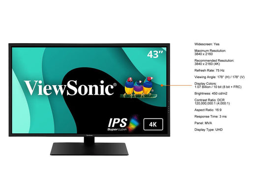ViewSonic VX4381-4K 43 Inch Ultra HD MVA 4K Monitor Frameless Widescreen with HDR10 Support, Eye Care, HDMI, USB, DisplayPort for Home and Office
