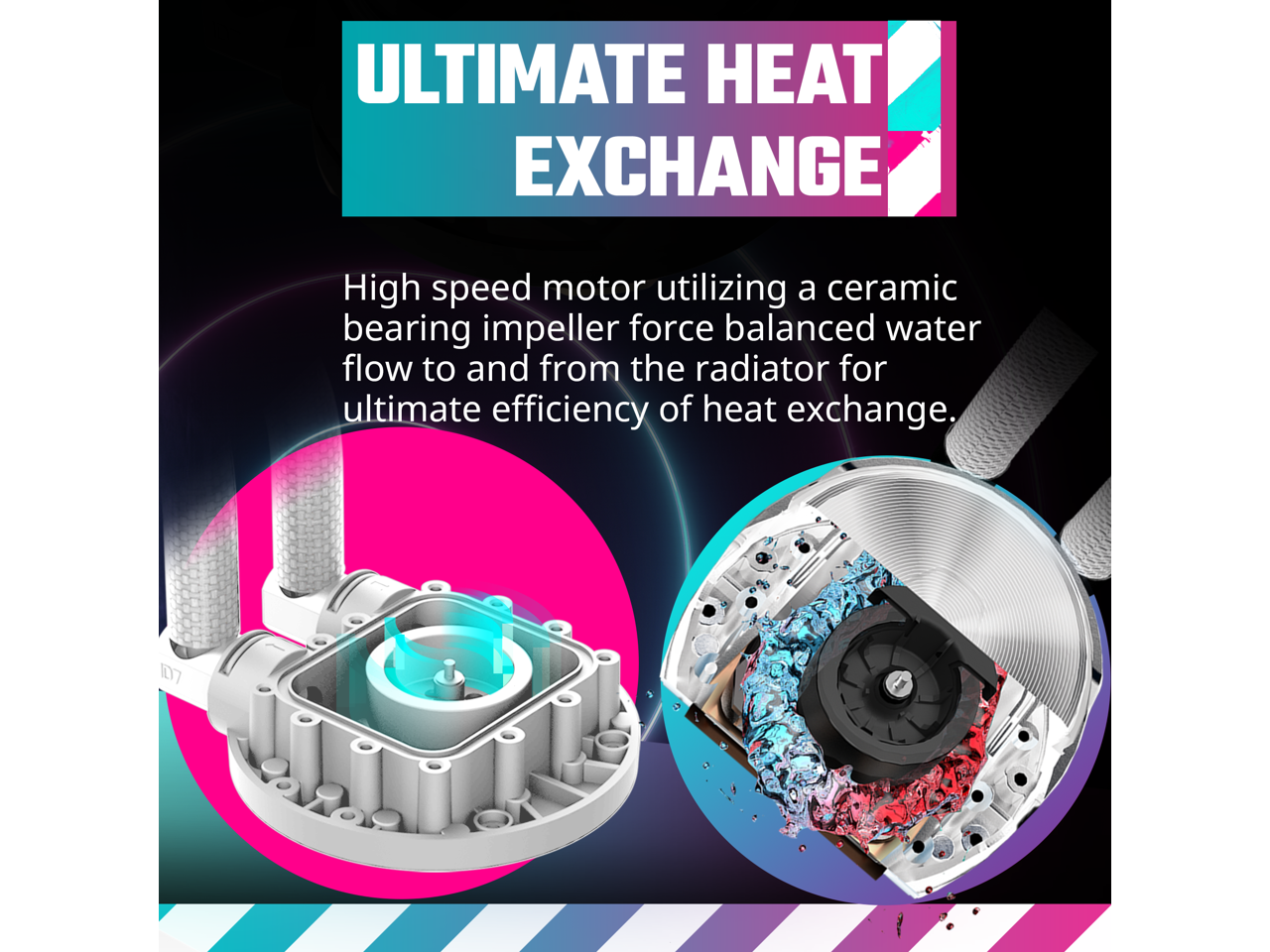 - Ultimate Heat Exchange: High speed motor utilizing a ceramic bearing impeller forces balanced water flow to and from the radiator for ultimate efficiency of heat exchange.