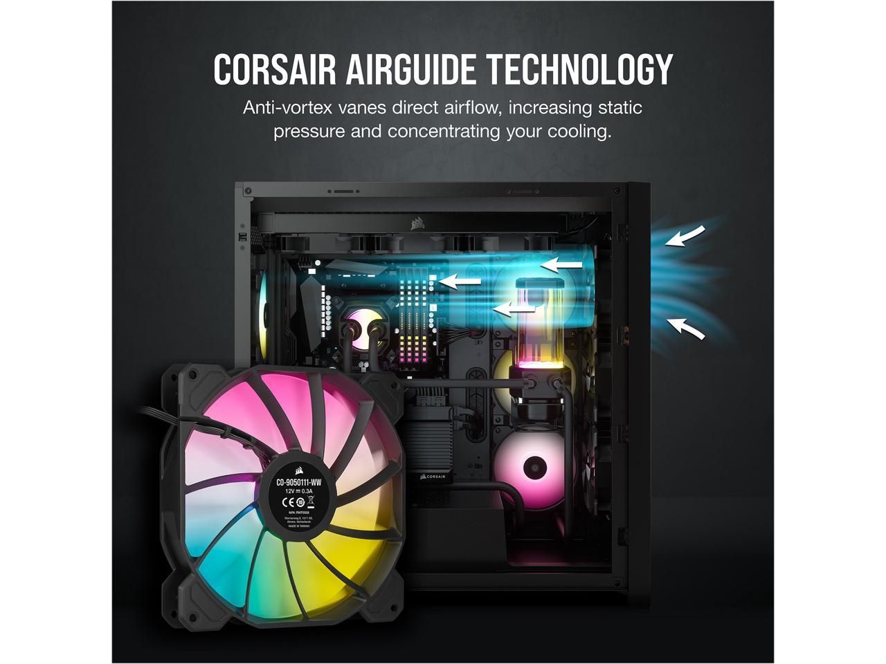 - CORSAIR AirGuide Technology: Utilizes anti-vortex vanes to direct airflow and concentrate cooling, improving cooling whether used as intake, exhaust, or mounted to a liquid cooling radiator or heatsink.