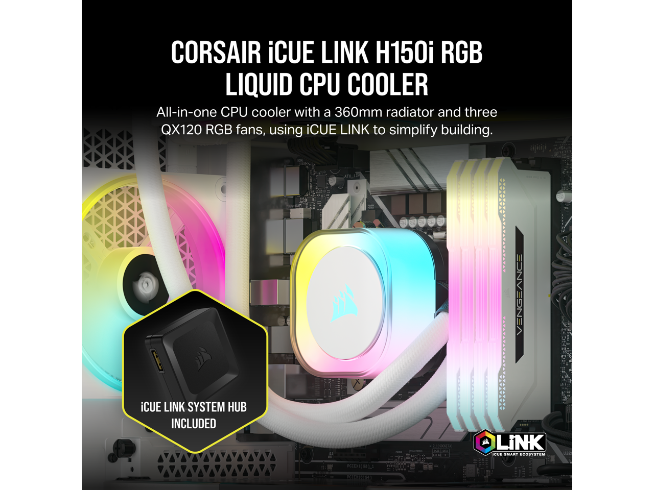 CORSAIR iCUE LINK H150i RGB Liquid CPU Cooler - QX120 RGB Fans - White - 360mm Radiator - Fits Intel® LGA 1700, AMD® AM5 - iCUE LINK System Hub Included