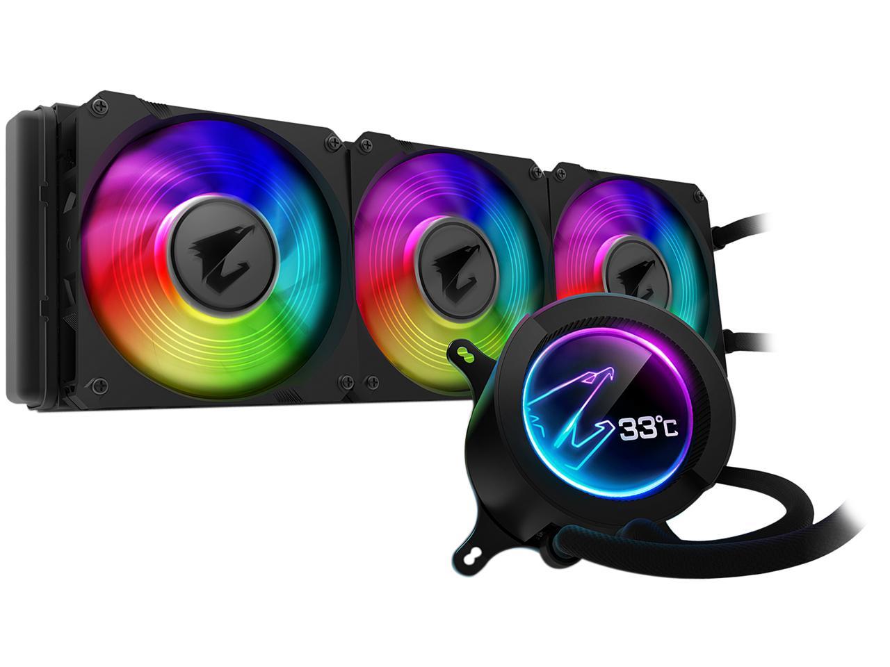 Incorporating a powerful waterblock, a 360mm radiator, and three dual-ball bearing 120mm ARGB fans, the AORUS Liquid Cooler 360 rapidly and quietly dissipates heat from high-end CPU, enabling it to deliver the full performance without throttling. A circular full-color LCD display integrated on the waterblock can be customized via AORUS Engine to showcase your desired content, including text, image, and hardware status. You can use RGB FUSION 2.0 to let the full-color display and three ARGB fans shine in unique lighting patterns and enable effortless synchronization with other AORUS devices.