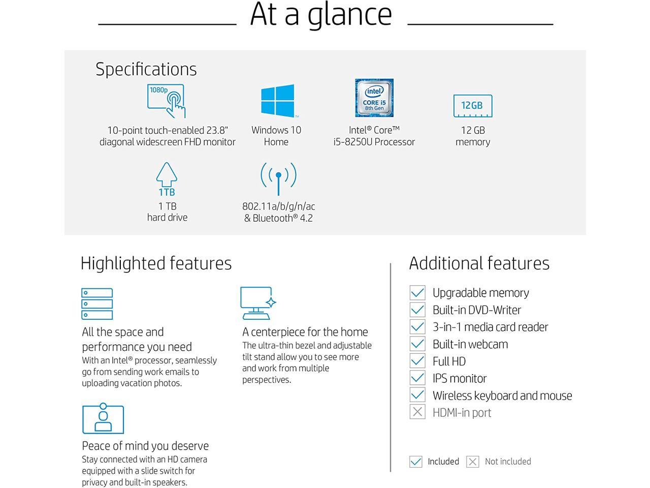 HP 24-f0000 24-f0060 All-in-One Computer - Intel Core i5 (8th Gen) i5-8250U 1.60 GHz - 12 GB DDR4 SDRAM - 1 TB HDD - 23.8" 1920 x 1080 Touchscreen Display - Windows 10 Home 64-bit - Desktop - DVD